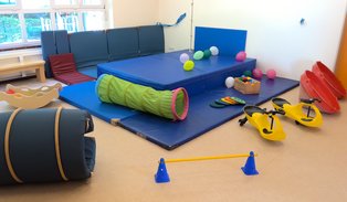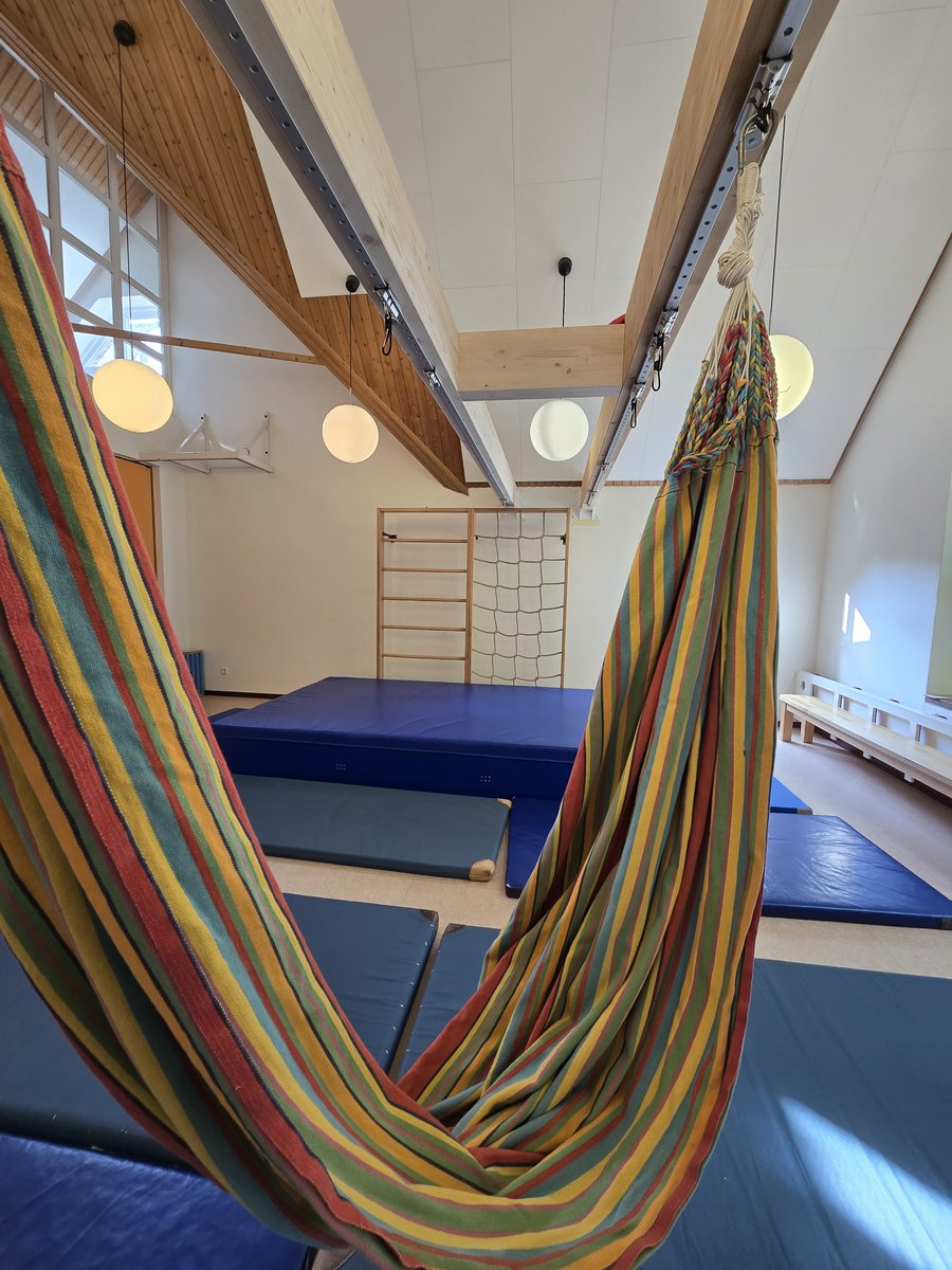 In der Turnhalle stehen uns viele Materialien, die eine gute Förderung der Kinder unterstützen zur Verfügung. Kletterwand, Hängematte, Turnmatte, Bälle, Schwungtuch, Rollrutsche, Balancierbalken und vieles mehr. Verschiedene Materialien aus dem Bereich der Psychomotorik sind in der Turnhalle vorhanden. Die Kinder können mit Balancierbrettern, Balancehalbkugeln und anderen Materialien selbständig Bewegungslandschaften aufbauen.