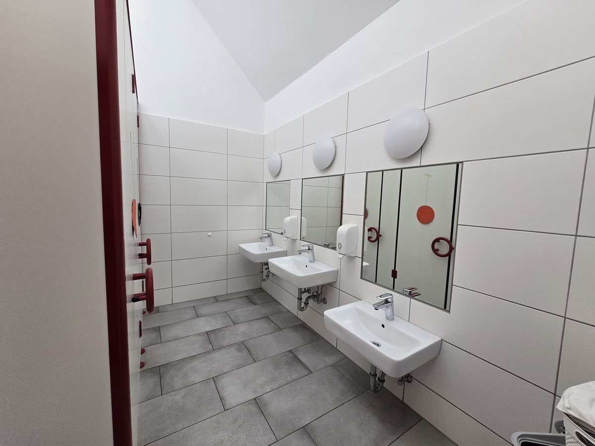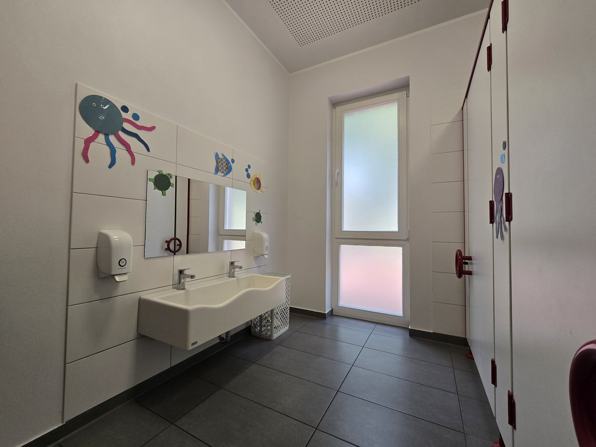 Jede Gruppe hat einen dazugehörigen Waschraum. Alle Waschräume wurden im Jahr 2022 saniert und den Bedürfnissen der Kinder angepasst. Es gibt Waschbecken und Spiegel in verschiedenen Höhen, Toiletten für die verschiedenen Altersgruppen und einige Toilettenkabinen wurden vergrößert, um auch Kindern mit körperlichen Einschränkungen genügend Platz zu bieten, wenn eine weitere Person für Hilfestellungen beim Toilettengang benötigt wird. Toiletten, die der Kindergröße angepasst sind, regen Kleinkinder zur selbständigen Nutzung an. Eine dem Körper entsprechende Toilette, und damit auch der sichere Stand der Füße auf dem Boden, während das Kind auf der Toilette sitzt, sind Voraussetzung, um dem Kind den Übergang von dem Tragen einer Windel zu dem eigenständigen Nutzen einer Toilette zu ermöglichen.