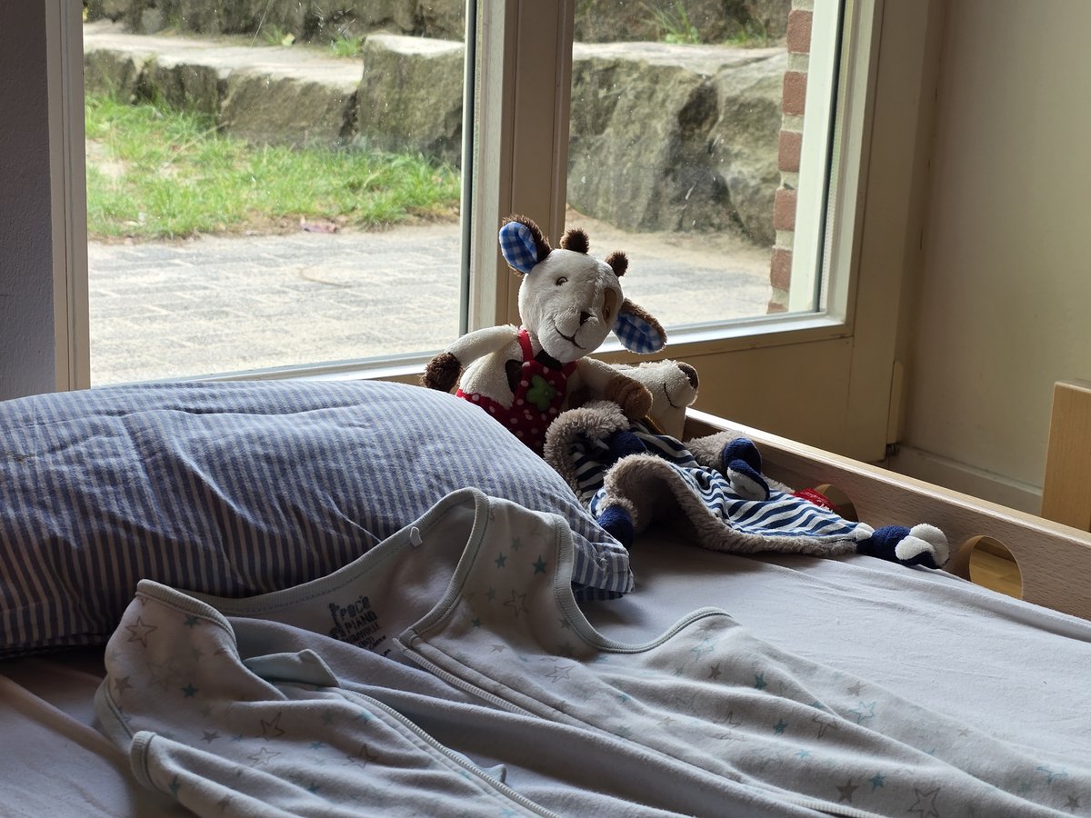 Rituale sind für Kinder von großer Bedeutung und geben ihnen die nötige Sicherheit. Ein eigenes Bett und ein abgegrenzter fester Schlafplatz in gemütlicher Atmosphäre sind daher notwendig. Wir haben zwei verschiedene „Bettarten“ und jedes Kind bekommt ein Bett, das dem Entwicklungsstand und auch dem Bedürfnis des Kindes entspricht. Kinder, die noch nicht selbständig laufen können, liegen bei uns in sogenannten „Gitterbetten“. Sobald das Kind sicher Laufen und aufstehen kann entfernen wir einen Teil der Gitterstäbe um dem Kind ein selbständiges ins Bett gehen und auch aufstehen zu ermöglichen. Jedes Kind, welches den Wunsch hat, bekommt von uns ein kleines, der Körpergröße entsprechendes Holzbett, ganz ohne Abgrenzung in Form von Stäben. Bis zur Vollendung des 2. Lebensjahres schlafen bei uns alle Kinder in einem Schlafsack, um die Erstickungsgefahr einzudämmen. Ab dem 3. Lebensjahr entscheidet das Kind, ob es weiterhin in einem Schlafsack oder mit einer Bettdecke schlafen möchte.